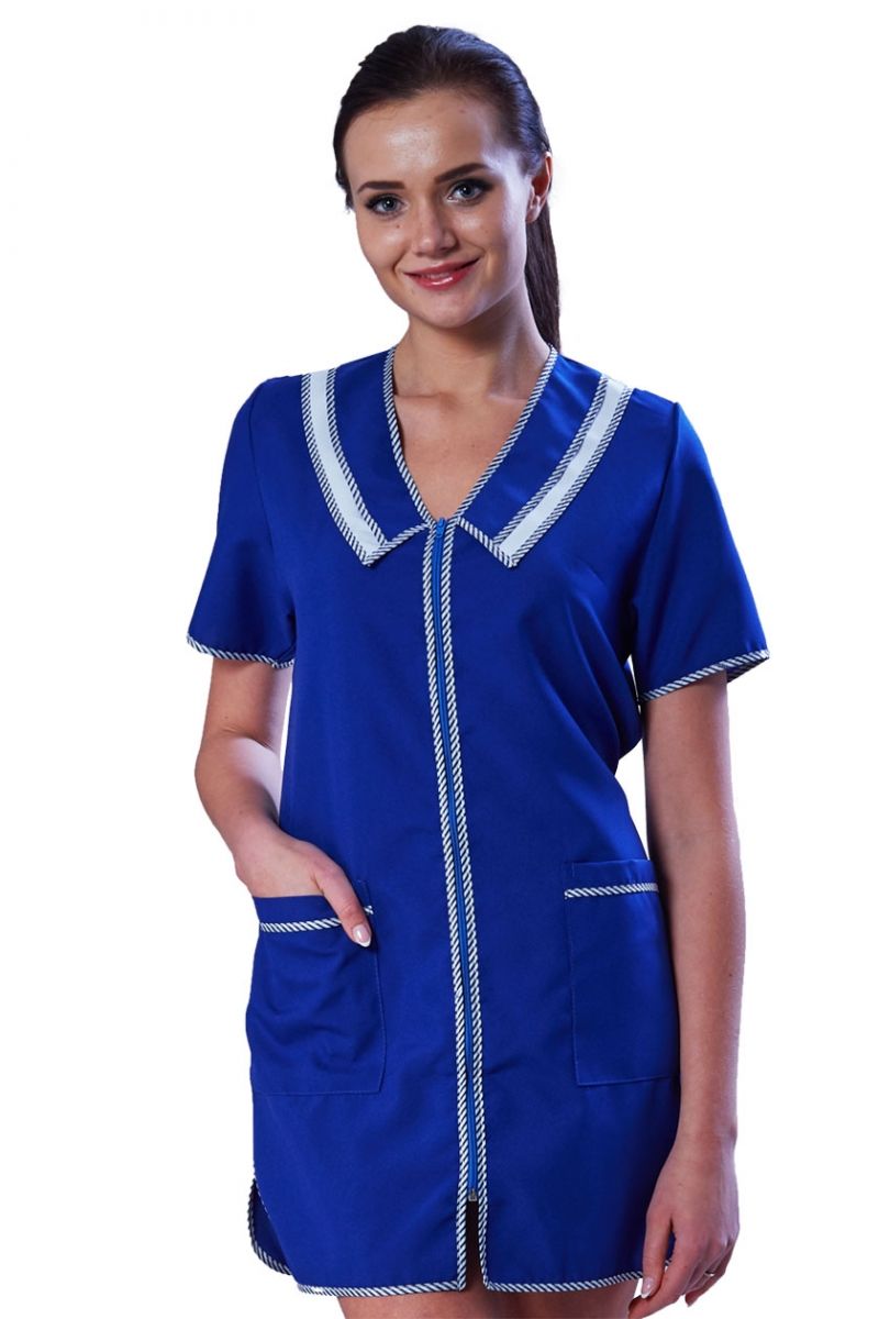 Халат укороченный, застежка на тесьму «молния», накладные карманы, коротки рукава.
