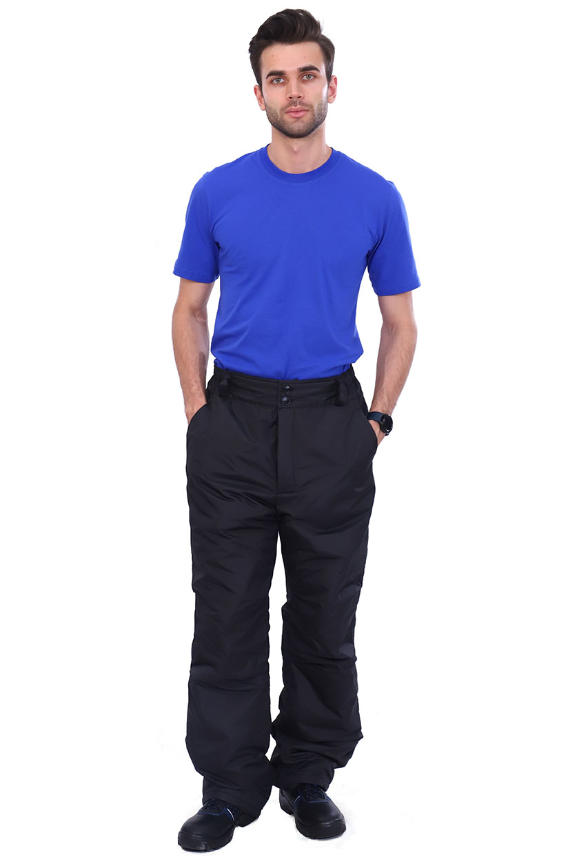 Брюки мужские утепленные прямые с широким притачным поясом, частично на резинке, с пятью шлёвками. Два боковых кармана, застёжка гульфа на молнию. По низу брюк внутри снегозащитная муфта.